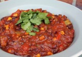 Вегетарианское чили с черной фасолью, помидорами, кабачком, кукурузой, сладким и острым перцем и специями.