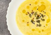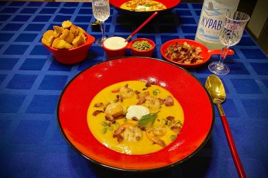 Тыквенный суп-пюре с имбирем, беконом и креветками