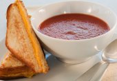 Идеальное сочетание для обеда выходного дня – ароматный томатный суп и всеми любимые тосты с сыром, поданные вместо сухариков.